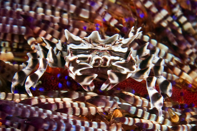 Zebra crab on fire urchin, Lembeh. Photo by Larry Polster