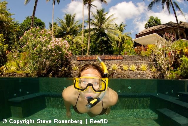 My daughter, Shanon, posed vertically for an over-under shot in the Kasawari-Lembeh pool. She won the trip by winning the Monterey Shoot-out photo competition on her third and fourth divies with a camera!