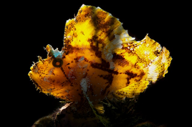 A number of years ago (about thirty actually), I was free diving in Ke’e Lagoon on the northeast shore of the Island of Kauai. I spotted a really unusual looking fish. It seemed to be sitting upright on the sandy bottom in a depression in a coral head, balancing on its pectoral fins. I was intrigued because I had never seen anything like it. I made a mental note of my observations and I remember describing it to the staff at the local dive shop as being reddish brown in color, about four inches long, having a solid dorsal fin that sloped downward toward its tail and the appearance of rocking side to side. All I got for my efforts was a quizzical look and a shrug of the shoulders. How cool would it have been if I could have pulled out my iPhone and Googled an identifier website and punched in fish, location, color, general body shape, and a description? I would have almost instantly known that I had not been hallucinating, but that I had just seen a Taenianotus triacanthus or red leaf scorpionfish.