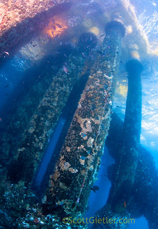 In this photo, your eyes are led up the lines of the rigs structure to an interesting area of reflections on the surface. Oil rigs, southern california.