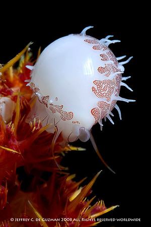 The subject here is emphasized because of the blackground behind it. This is a small cowrie on a soft coral, photo by jeff de Guzman, uncropped.