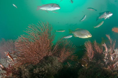 White sea bass are a good example of a skittish fish that is hard to approach. With fish like this, the best way to approach is by freediving, without scuba gear. When freediving, I’ll often use only 1 strobe to reduce drag. For best light levels, I’ll try to go only when it’s sunny out. Put your strobe out as far as it will go, and point it outwards to reduce backscatter. Try to swim down so you are at the same level as the fish or slightly below, don’t shoot “down” at the fish if possible. White sea bass will usually make one quick pass, so be ready. It helps to really know your camera focus modes to get the fastest possible focus, and adjust your zoom before head. Here’s an article on shooting in low light or low contrast conditions underwater. If the vis is not good, that makes it even more important to get as close to the fish as possible.