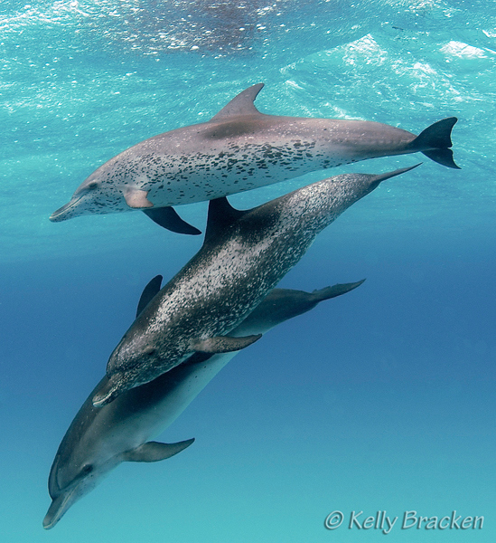 Three dolphins, bahamas. Photo by Kelly Bracken. d100, Nikon 16mm lens, 1/125th, F5.6. Shutter priority mode was used for this shot, no strobes were used. Kelly was snorkeling/freediving in 15ft of water for this shot. The sharpness of the shot, diagonal composition, and surface at the top of the photo all help make this a beautiful shot.