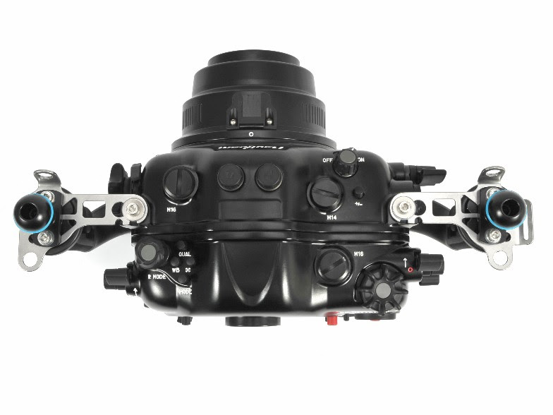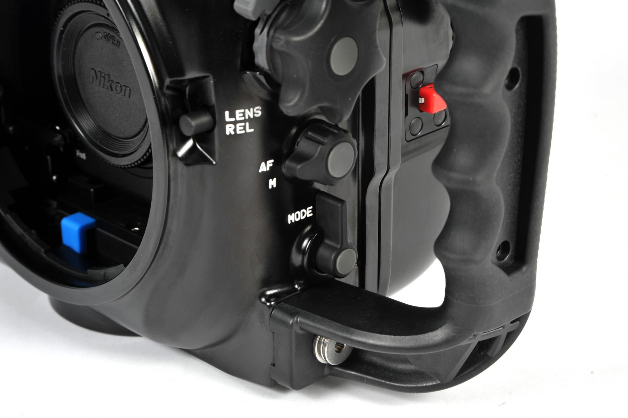 The Nikon D500 camera in a Nauticam NA-D500 housing offers three assignable pushbuttons (AF-ON, Fn1, and Fn2) that can all be accessed from the housing handles.