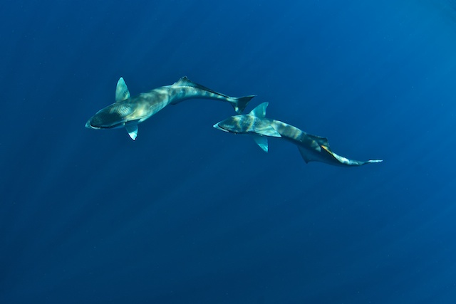 A pair of lone remoras passing below in between waves of whale sharks. Tokina 10-17mm at 10mm, F9, 1/160th.