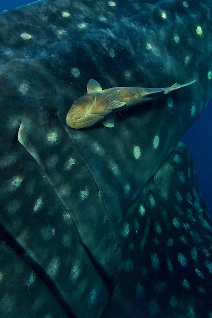Remora on the back of a passing whale shark. Nikon AF-S 10-24mm DX at 24mm, F8, 1/125th.