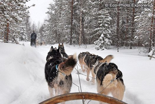 The dog sled team journeys deep into the magical forests in the Lapland region