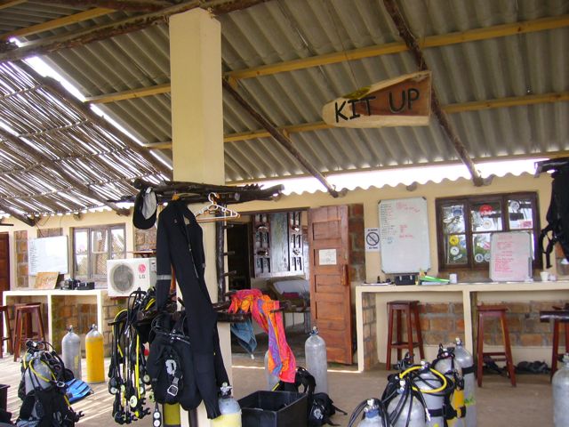 In the morning we were excited to get to the diving. The Tofo Beach area is primarily known for big and abundant megafauna including humpback whales, manta rays and whale sharks… what a combination! We set out for Tofo Scuba, which was just a few minute drive up the beach. We were greeted by Joan, the manager. Joan had been fully briefed on our impending arrival and went about getting us set to dive. Since the domestic airlines LAM had “misplaced” all of our luggage en route from Kilimanjaro to Maputo, we arrived without any of our dive gear. The staff at Tofo Scuba went over the top to help outfit us and some of the dive masters even lent us their personal gear.