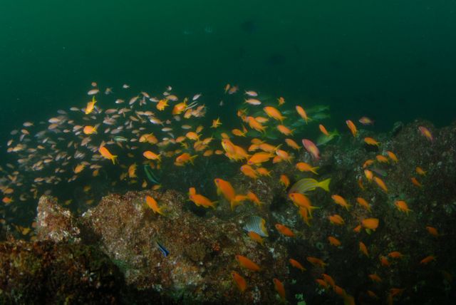 We knew that mantas and whale sharks would be our main attraction, but what we weren’t prepared for were the total “unusual” conditions we found. The water, which is normally about 26c (78.8F) this time of year varied from 20c (68F) to a bone-chilling 16 (60.8F). Since I am normally cold in a 7mm in 85 degree water, you can imagine my shock in a rented 5mm in 60! Not only that, but because of the upwelling associated with the unusual wind direction the normally clear water was very green and fairly dark with a range of 20’ to 30’ visibility. I didn’t even to rig my video the whole week.