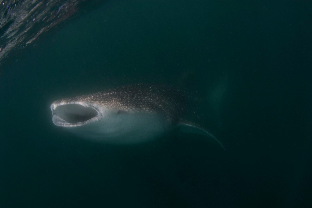Over the next five days neither the temperature nor the visibility improved. However, it was GREAT time for whale sharks. We had plentiful opportunities to freeze our butts off chasing whale sharks and watching them turn vertical and suck in the plankton soup. The mantas were also present and probably in more force than we could see. We simply had to imagine that behind the two or three we saw on each dive there were more following. Given the number we saw splashing and leaping on the surface, this was undoubtedly true.