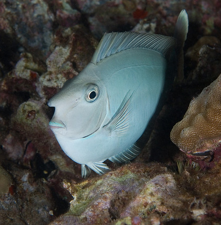 All of the basic rules, get close, shoot up, etc., apply when you are trying to take interesting pictures of fish. The main difficulty is with “get close.” Do not chase fish! They will simply swim away and all you will have to show your friends are images of “fish butt.” Fish tend to be very skittish around divers and a slow, methodical approach tends to work the best. Start taking pictures of your quarry from a distance, gradually decreasing the distance between you and the fish. Once you get close, move very slowly, in a non-threatening manner; make small bubbles (no sudden, large exhales); and take as many images as you can, from different angles. Think about the pictures and compose your shots. Use the rule of thirds, think magazine cover, shoot portrait rather than landscape, use negative space, shoot up, move the strobes around, and take as many pictures as you can in hopes of getting that one, magical “keeper.”
