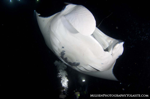 Both species of manta ray occur circumtropically. If you are traveling specifically to see mantas some good bets include the Maldives, Bali, Isla Mujeres, Socorro, the Great Barrier Reef and Yap. If you really want an experience though, Kona Hawaii proclaims itself as the manta capital of the world. Kona’s reefs have many cleaning stations where mantas can be encountered during the day with some degree of reliability. Once the sun goes down the action really starts to heat up. Divers gather at one of two sites and work together using their dive lights to concentrate the plankton. And to the delight of the guests, as many as 40 mantas have been known to cue in and spend their evenings swooping through the plankton clouds. You can expect closer-than-close encounters. The mantas will cruise within inches of your head, often giving you a slap as they swim past. The lights from hundreds of divers create an atmosphere more akin to a Vegas show than a coral reef, complete with giant, dancing stage performers. This really is the ultimate manta experience.