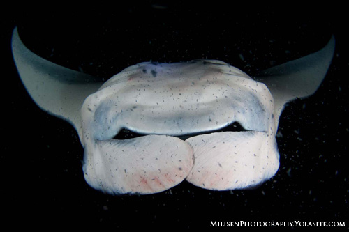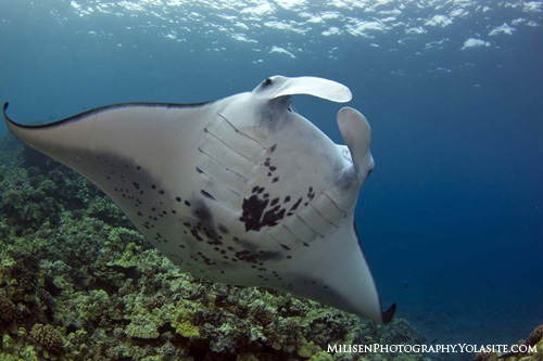 These are the smaller of the two species, smaller being a relative term. They can attain a width of 18 feet and as their name suggests, generally stick close to shore. Coastal mantas come in one color variety. Look for shoulder slashes that run parallel to the angle of the mouth and white underbellies with black spot patterns. These black spots are actually unique for every coastal manta ray and have been used in photo-identification studies to tell the mantas apart.