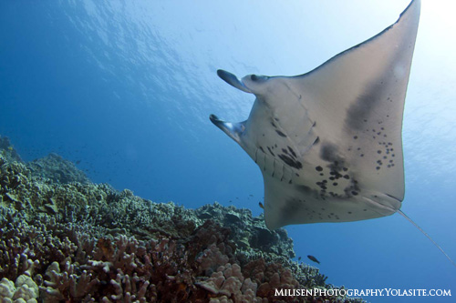 Reefscape – To pull off a reefscape, it really helps to have a cleaning station where the animal will predictably come through the composition multiple times. It is best to think of reefscapes in three parts. The foreground could be the manta or it could be an interesting coral formation. The mid ground will usually be whichever reef or manta was left out of the foreground. The background is going to be some variety of blue, perhaps with a diver or boat in silhouette, but often it will just be the rippling surface.