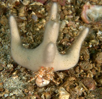 In the Sea of Cortez some hermit crabs use living, growing Hydrocoral and others, in the Indo-Pacific region, live in the fixed wormholes left by marine worms.