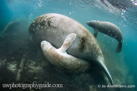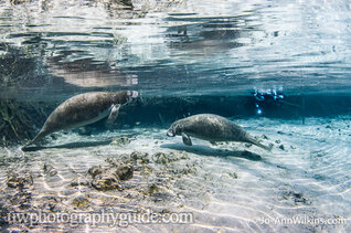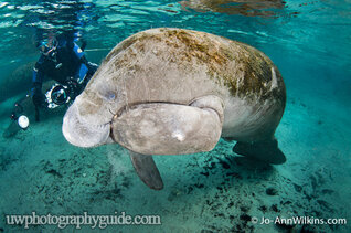 The best place to dive with manatees is Crystal River in Florida. Crystal River’s economy revolves around its manatees, so it is easy to find manatee tour operators and accommodations in the area. Trips are usually a few hours long. Underwater photographers who would like to spend more time with them in the water can also rent a boat. By renting a boat, you can spend the whole day in the water with the animals and not worry about crowds of tourists. When visiting Crystal River, the best place to observe the manatees is a site called Three Sisters Springs, where underground fresh water springs emerge. The water is crystal clear and warm, and the bottom is covered with delicate white sand. When the temperature outside gets cold, the manatees swim into this incredibly beautiful bay to rest and warm up.