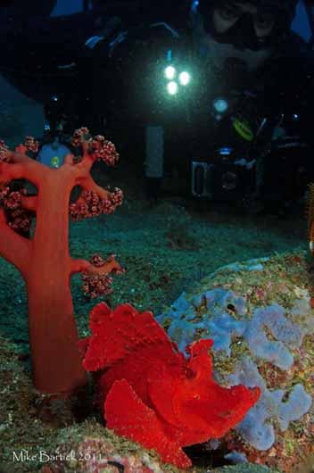 "I've found a Rhinopias. Now what?" Portrait photos are a great way to catch striking images of these ornate creatures. Look for contrasting backgrounds to make your subject "pop." Use your imagination with lighting. Positioning your modeling light off-camera can lend some nice drama to the shot. Incorporating a model can lend a whole new aspect to the shot as well. Working the shot with a dive buddy can often yield some great fun photos, so be sure to keep your head in the game and get creative. Read more about photographing behavior.