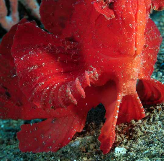 Rhinopias are a lie and wait predator that ambushes their prey by using a combination of camouflage and movements. The first few spines of the lateral fins have evolved into articulating toes if you will. These toes or "claw" helps them to hook into the substrate and pull themselves along. This is all part of the hiding and hunting façade as seen in other bottom-dwellers. By flopping about the bottom, other fish will discount the movements as flotsam or perhaps a wounded fish and come in close to investigate. The two white decoy spots below the eyes are distracting enough to mislead the prey. And as the unsuspecting fish approaches to investigate, the Rhinopias carefully watches, gauges the distance, and then all at once, the Rhinopias' jaw drops and inhales the fish.