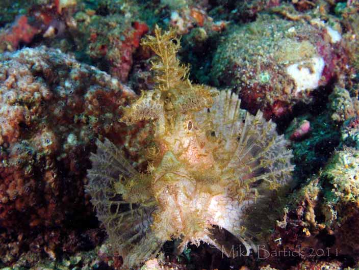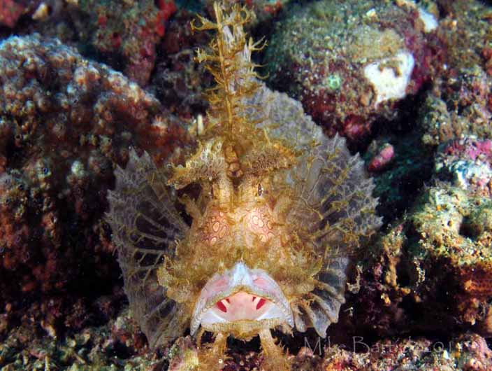 The aphanes' or frondosa’s camouflage is perhaps the number one feature and reason that so many naturalists are driven to see them, and depending on the particular fish, each individual’s appearance will vary. They are covered with skin tags or elaborate frondosa that mimics the algae or soft coral and crinoids of its immediate surroundings. The base coloration is maze-like, striped, or blotchy. But both always have the tell-tale white spots under each eye. This is a common decoy eye that enables the predator to watch the prey, without detection. They can be found in rather shallow waters ranging from 10 feet to 50 feet, living amongst soft coral and algae, broken rubble, and sandy patches.