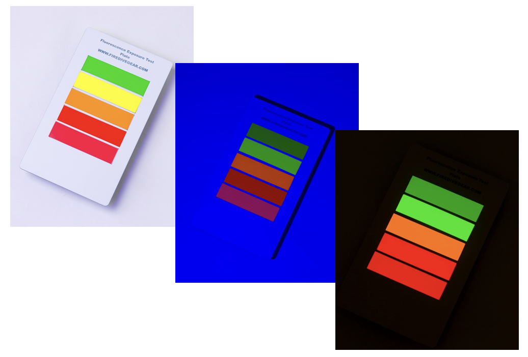 The images below illustrate the effect of the barrier filter. The first image is of a fluorescent “slate” that was photographed under white light. The second image is the same slate under blue excitation light and the final image was taken under blue excitation light with a yellow barrier filter placed over the camera lens. It can readily be seen how much visual acuity is reduced because a barrier filter over your mask will have the exact same effect as that over the camera’s lens. The barrier filter is required however because as noted earlier, the blue light completely overwhelms the fluorescence emission of marine organisms which don’t “light up” like this slate does.