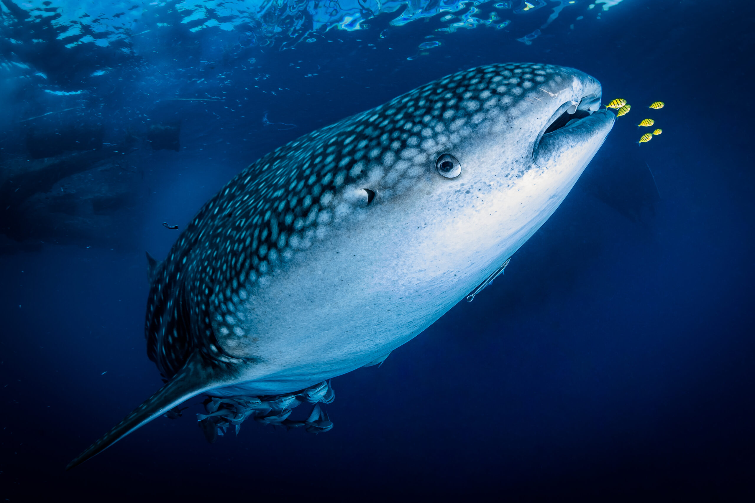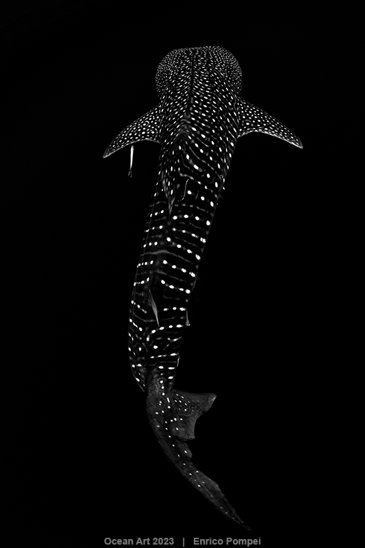 In juvenile whale sharks the white dots of their livery are very evident and they shine under the solar and flash light. Reviewing the photos at home i noticed that in the last shot, taken just before he disappeared in the blue, the livery was depicting a the silohuette of the shark like a constellation in the dark water, the “Platonic idea” of a Shark..