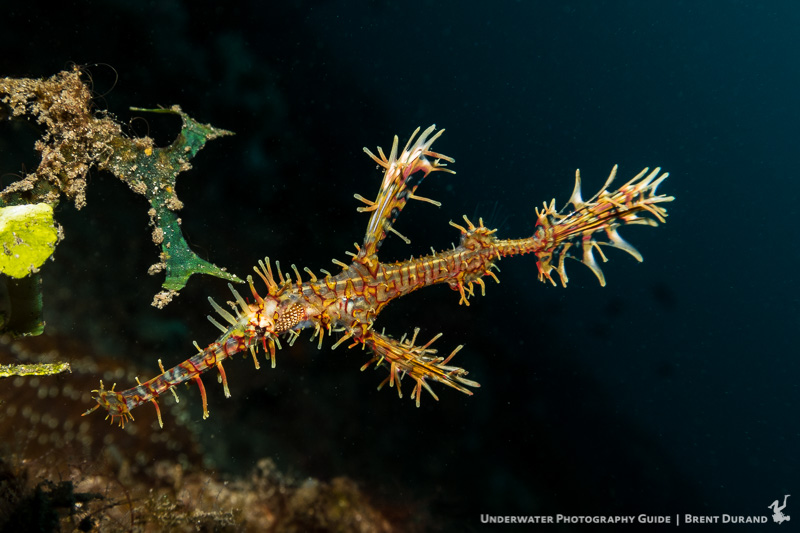 An ornate ghost pipefish poses for a portrait with the Canon G7 X II in Fantasea G7XII housing in the Lembeh Strait, Indonesia. ISO 125, f/8, 1/200. Shot with a single SeaLife Sea Dragon flash. Photo: Brent Durand